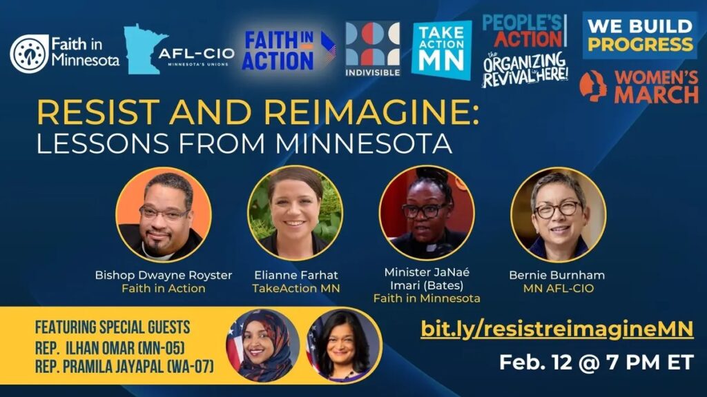 Organizers and community members in Minnesota are transforming crisis into action and tragedy into solidarity. Join us on Thursday February 12th from 4:00 to 5:15 PM for a conversation with labor and community leaders from Minnesota including Reps. Ilhan Omar (MN-5), Pramila Jayapal (WA-07) and special guests. They’ll share practical lessons for fellow organizers on organizing in the midst of crisis, rapid response, economic solidarity actions, and how Minnesota’s experience can help other communities prepare to protect each other. RSVP HERE